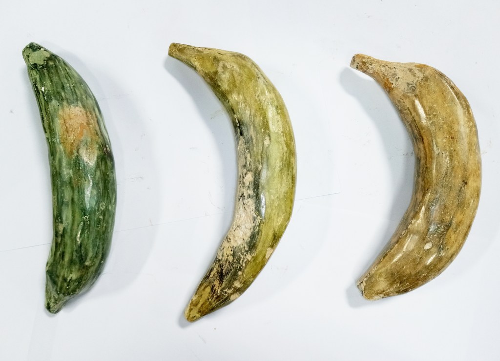 I made these out of clay for an upcoming fundraiser for Unassigned Gallery. They are from left to right (by weight) the representational equivalent of 11.1, 10.6 and 9.3 hours of the radiation one would receive from human contact.