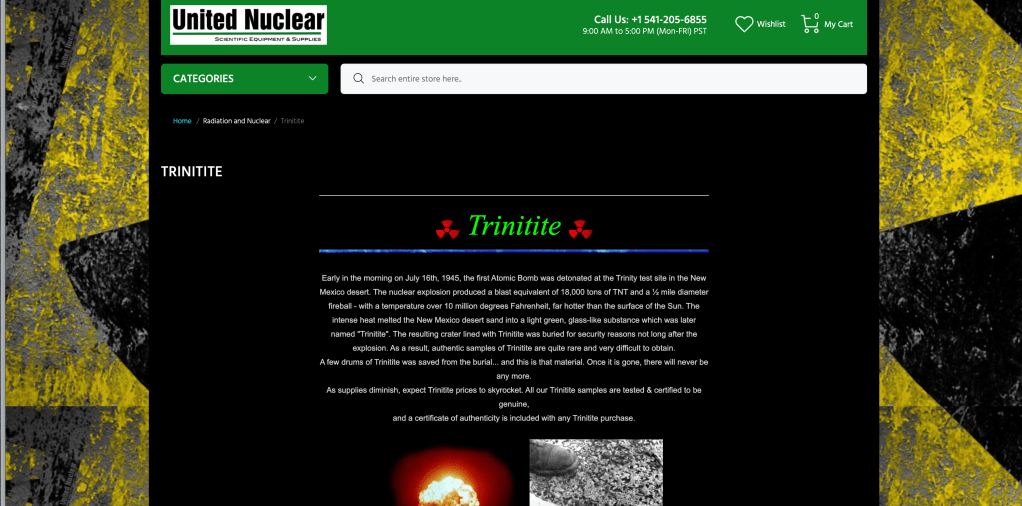 I really wanted to get a specimen of Trinitite from the Trinity explosion. Luckily for me, United Nuclear sells it and a whole bunch of other stuff i would love to buy. Also i love their website.