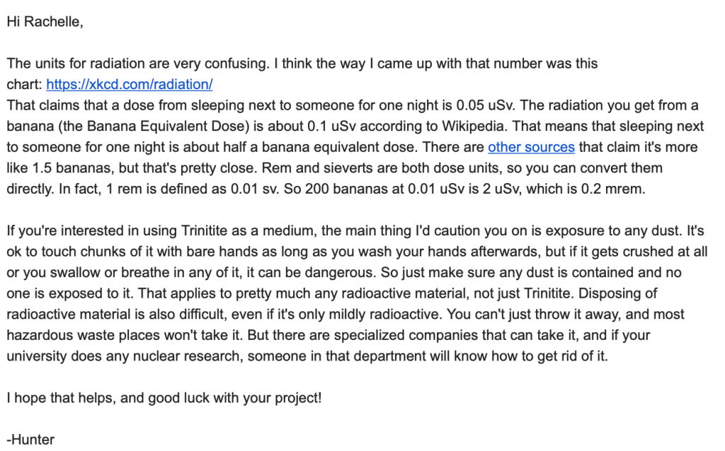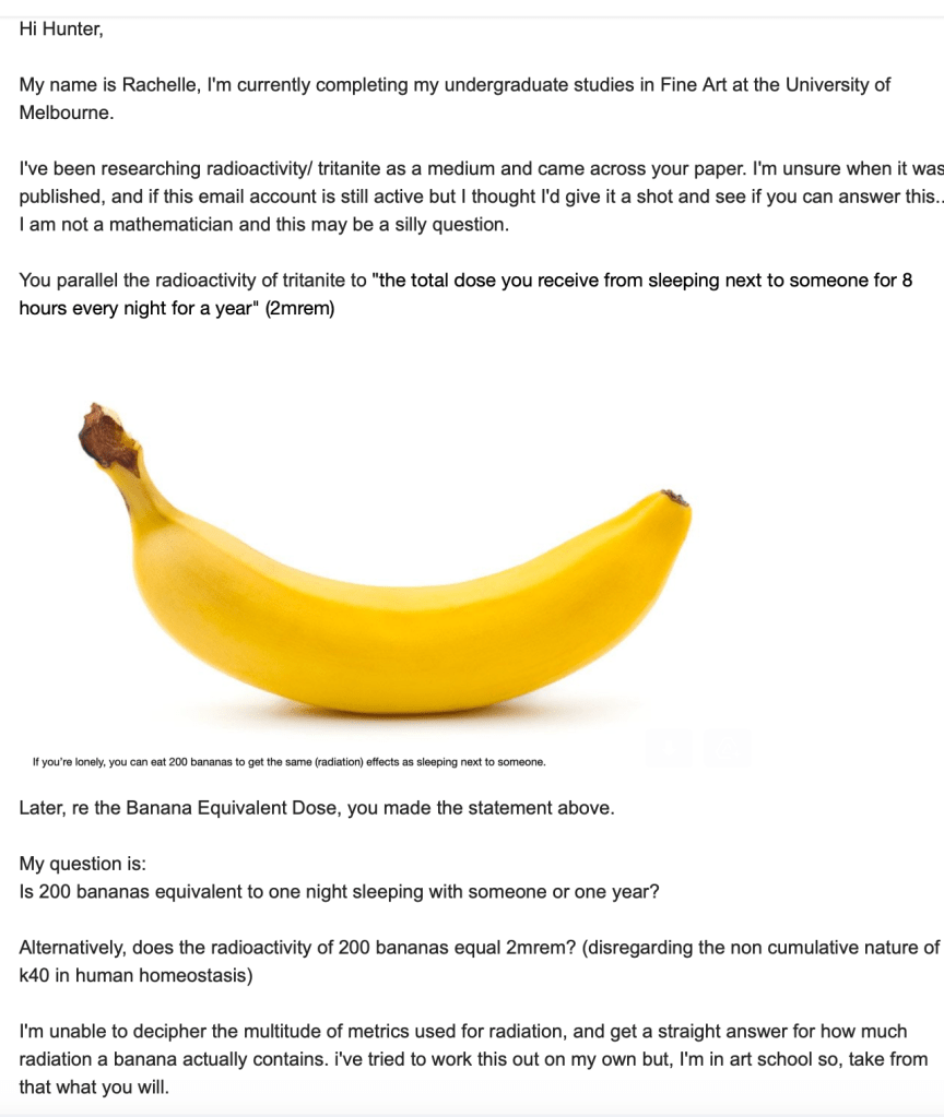 Its a learning tool, not an exact representation, and the poetry of it isn’t lost whether the exact sieverts are correct or not (also, watch me deck someone in a crit/show/my studio doing the math to check).