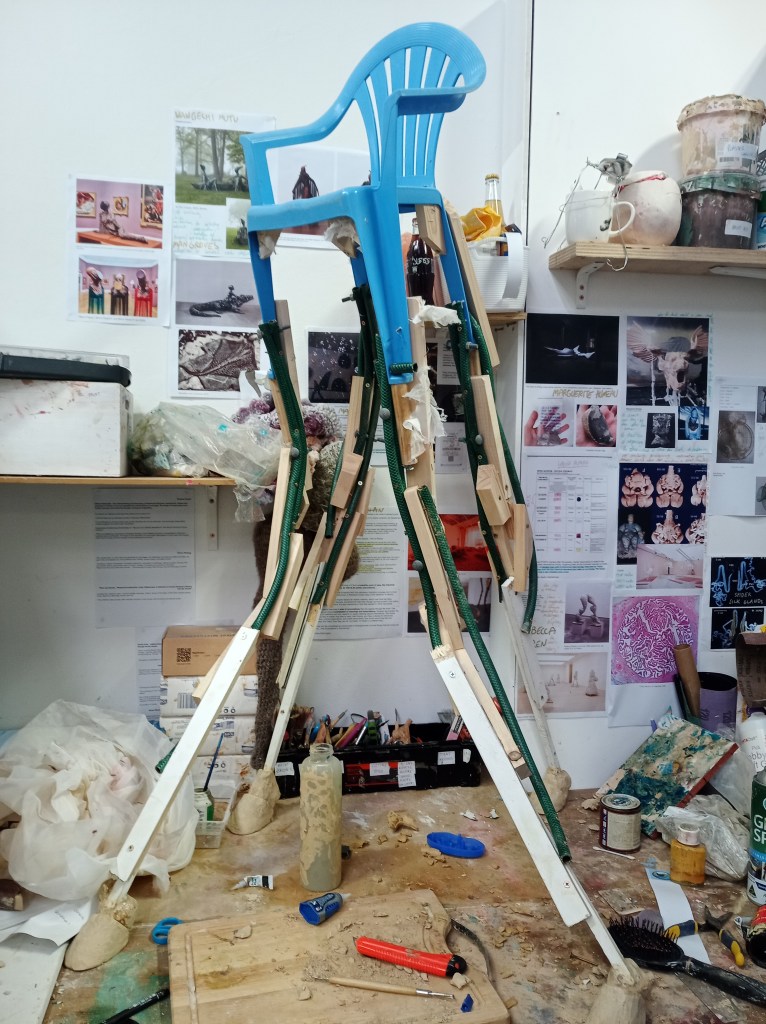 I don’t remember much of the process of making the legs. I scavenged bits of wood from the workshop and prep room. I scored the hoses from someone who didn’t need them anymore. The little chair was out front of a neighbour’s house with some other kid’s stuff. The hooves I had made a week before. They were carved and about leather-dry at that point.
