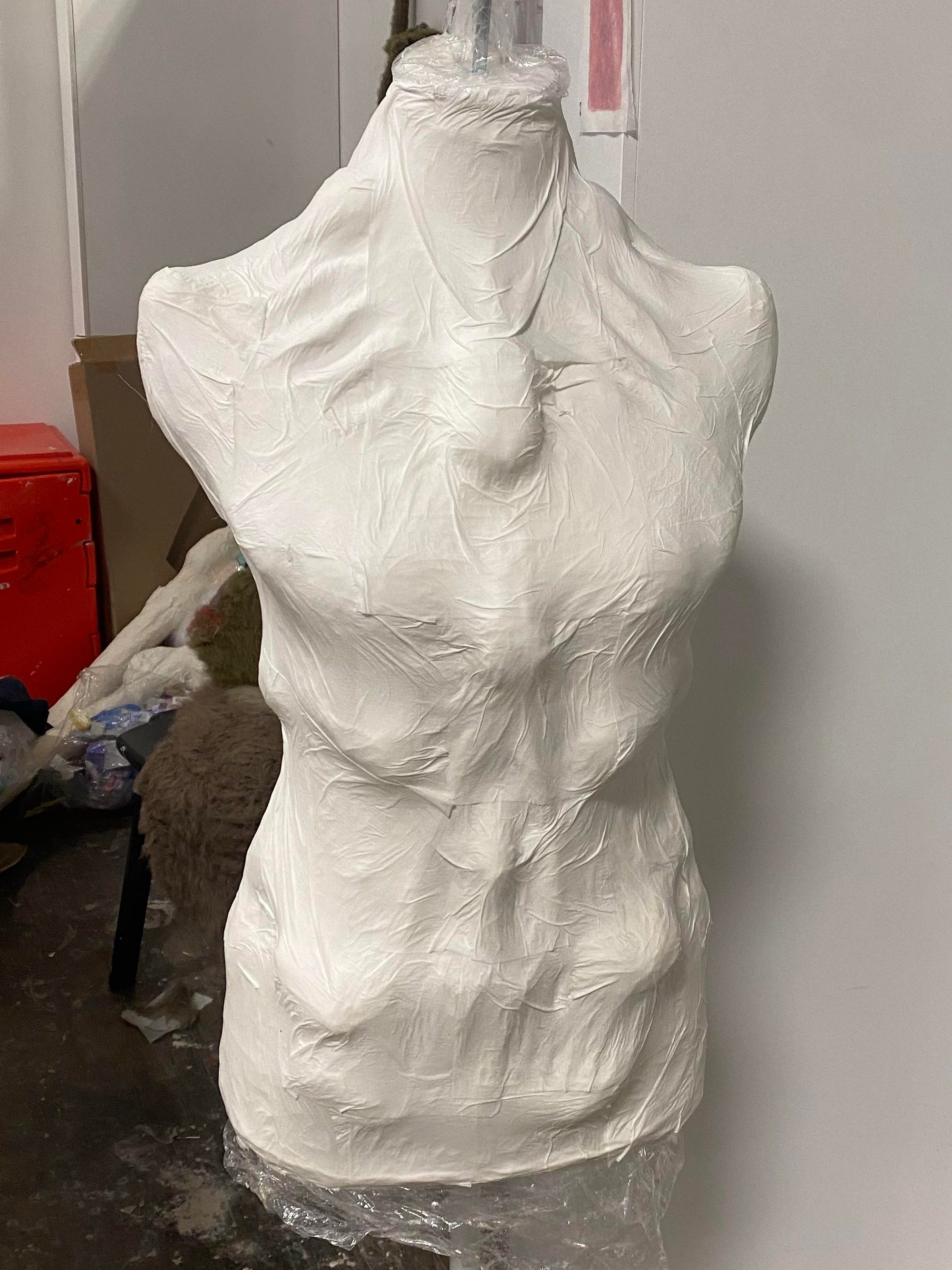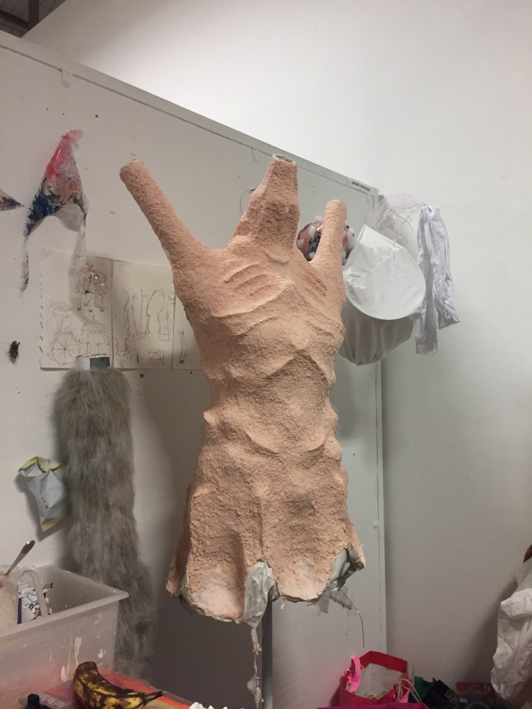 I remade the mannequin once before. I sawed the paper mache torso in half (below). The pink particles became aerated by the back and forth of the saw, collecting like dust bunnies on my desk.